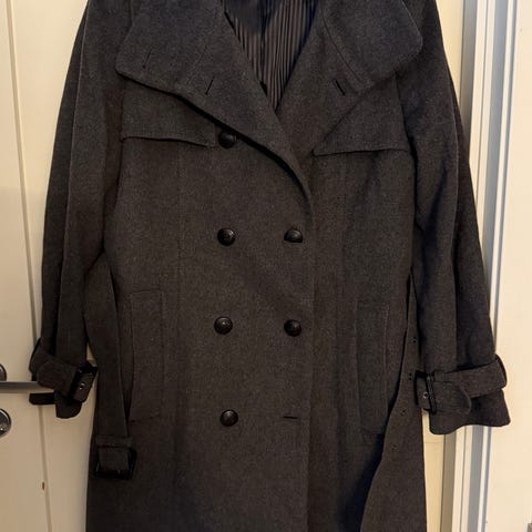 Varm, halvlang vinterfrakk med A-fasong. Kan kneppes helt opp i halsen. Romslig i smittet, enkelt å ha på ullgenser under. Store, gode lommer. Brukt en gang.