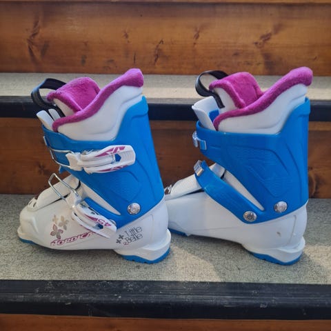 Nordica alpinstøvler for barn i størrelse 17,5. Støvlene har ytterskall i plast med justerbar spenne over vristen. Fargekombinasjon i rosa og hvit med grafiske detaljer på siden. Myk, polstret innersko for økt komfort og varme. Egnet til alpint bruk for barn som trenger en liten og lett håndterbar skistøvel.