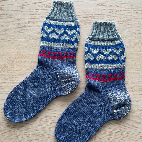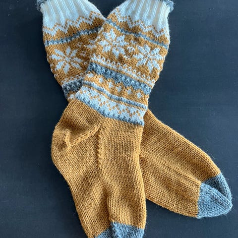 Strikkede sokker med mønster grå rød grønn