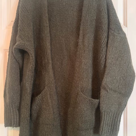 Håndstrikket cardigan for dame i størrelse L. Cardiganen er grønn og strikket i mohairull.. Åpen modell uten knapper, lange ermer og lengde ned over hofter. Passer over topp eller kjoler.