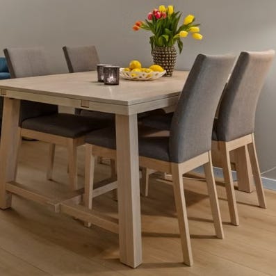 Spisebord i hvitoljet eik med 2 ileggsplater og 4 stoler