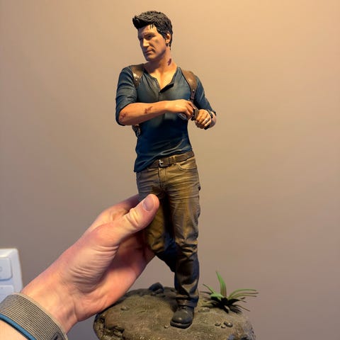 Figur av Nathan Drake fra collectors edition av spillet Uncharted 4: A Thief's End.