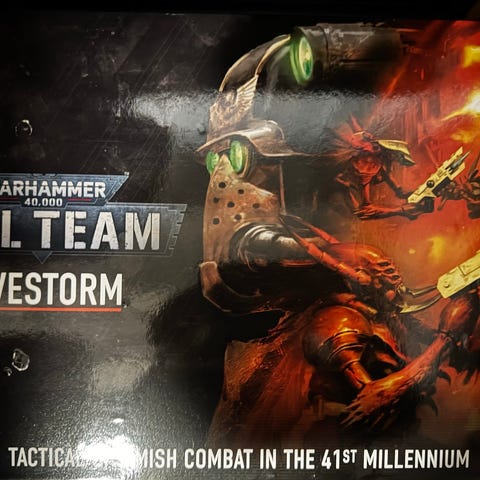 Ny og uåpnet Warhammer 40K Death Korps of Krieg Army Set miniatyrsett. Settet er ute av produksjon (OOP). Esken inneholder plastminiatyrer for bordspillet Warhammer 40,000, inkludert infanteri og kavalerienheter fra fraksjonen Death Korps of Krieg. Settet leveres som umalte og umonterte figurer som krever montering og maling.