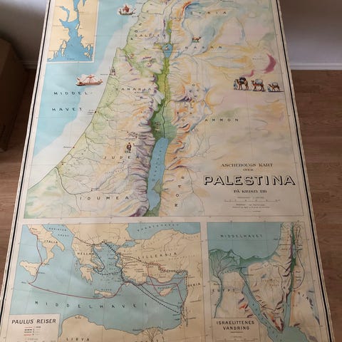 Parmanns Skolekart. Ca 1950. Bibelens Lande, Det hellige Land. Sjelden og nydelig, veldig stor. Kan rulles og sendes mot porto. Velkommen til å gi bud.
