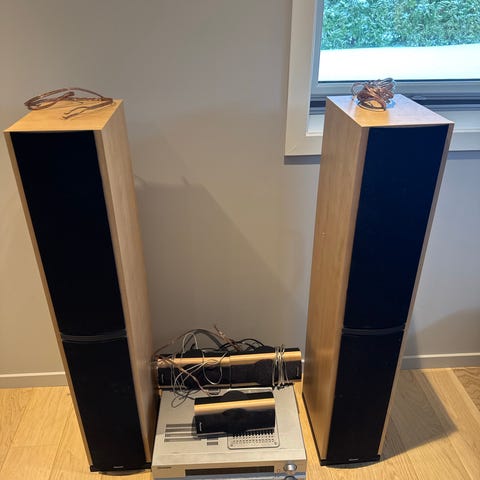 Maks effekt per høyttaler er merket til 150 W / 100 W (music/nominal). Settet er egnet som del av et hjemmekino- eller stereoanlegg sammen med en kompatibel forsterker eller receiver. Stativene gir plassering i lyttehøyde på gulv.