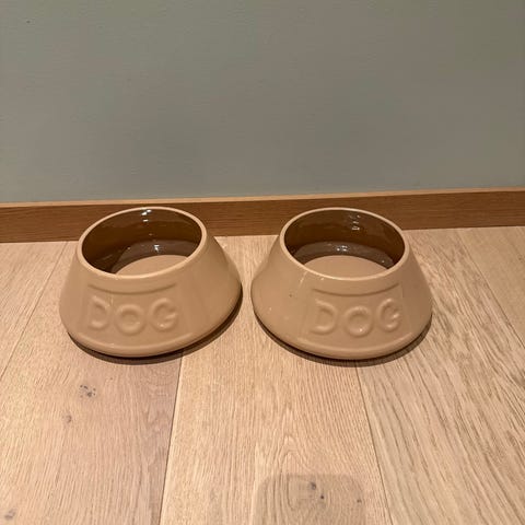 Mason Cash hundeskål i keramikk selges. Skålen har beige utside med teksten «DOG» i relieff og blå innside. Egnet til servering av mat eller vann til hund. Solid og tung utførelse som står stødig på underlaget. Kan brukes både innendørs og utendørs etter behov.