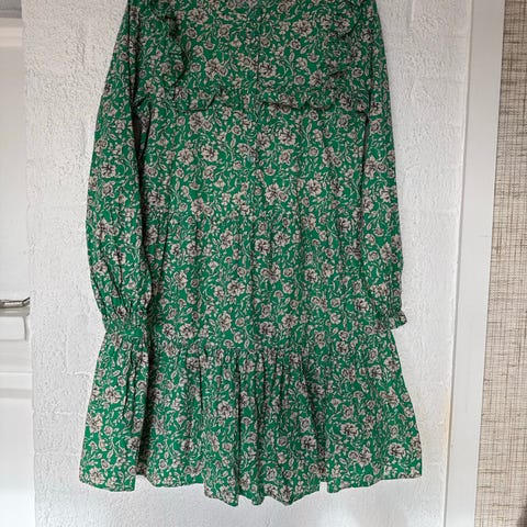 Vero Moda hverdagskjole i bomull i størrelse M. Kjolen er blå med smale vertikale striper, har knappelukking foran og 3/4-lange ermer med lett puff og strikk nederst. Den har en løs og rett passform med innfelt søm og lett rynking i livet som gir vidde i skjørtet. Egnet som hverdagskjole til dame.
