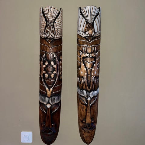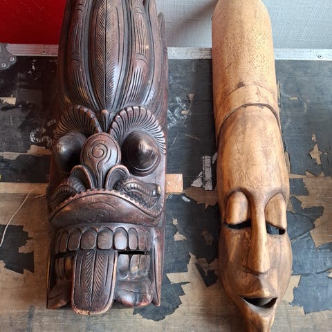 To flotte veggmasker i tre malt med klare farger. Dekorert med fargede glassbiter. Diameter ca 19 x 25 cm. Pris er for begge. Kan sendes med PostNord for kr 69,-.