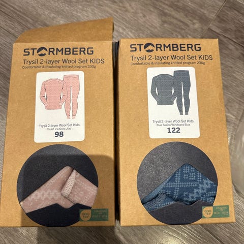 Materialet er merinoull, som er kjent for å være mykt mot huden og gi jevn temperaturregulering. Plaggene kan brukes som innerste lag under yttertøy i hverdagen, i barnehage eller til uteaktiviteter. Settet passer godt som basislag på kjølige dager.