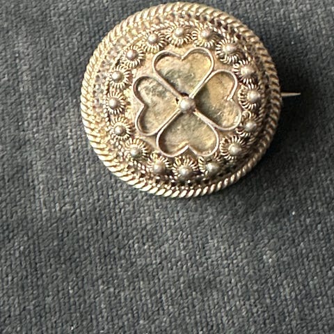 Hals nål / knapp. sølv for dame. Herre. Barn. Brosjen består av tre runde felter med preget blomsterdekor og én hengende rund plate med samme mønster. Laget i sølv med stempel på baksiden.