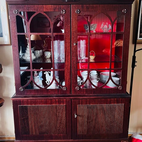 Vitrineskap i tre med glass i sider og front. Skapet har profilerte messingdetaljer langs kanter, hjørner og topp, samt dekorative beslag rundt nøkkelhull og langs rammene. Innvendig er det flere glasshyller som egner seg til utstilling av serviser, pyntegjenstander eller samlerobjekter. Skapet står på slanke ben med utskårne detaljer og har en overdel med gjennombrutt messingkant. Passer til bruk i stue, spisestue eller entré der det er behov for oppbevaring og presentasjon av gjenstander bak glass.