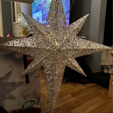 IKEA julestjerne bordlampe i hvit farge. Lampen har en stjerneformet skjerm med utskårne mønstre som slipper lyset gjennom og gir et dekorativt uttrykk. Plasseres på bord, hylle eller vinduskarm som juledekorasjon. Passer til bruk i innemiljø i jule- og vinterperioden. Laget av papir og metall/plast (fot og stang). Brukes med lyspære og ledning med strømtilkobling.