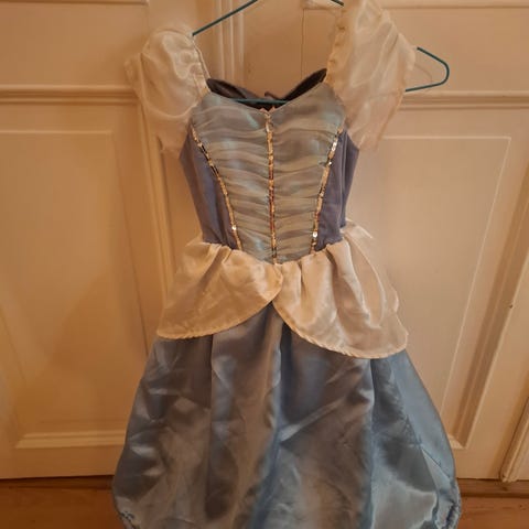 H&M utkledningskjole for jente i størrelse 122. Lang kjole i lyseblått med lange ermer og glansfullt stoff. Kjolen har trykte detaljer nederst på skjørtet og et lag med tynt stoff bak som gir kappeeffekt.