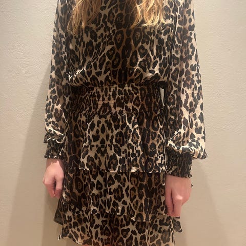 Selger en nydelig kjole i eksklusivt leopardmønster med vakre, feminine detaljer. Kjolen har en flatterende V-utringning, lange ermer og markert midje som fremhever silhuetten på en elegant måte.