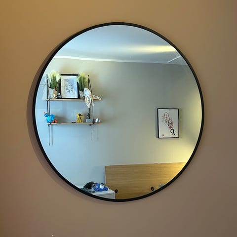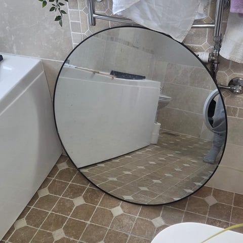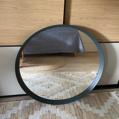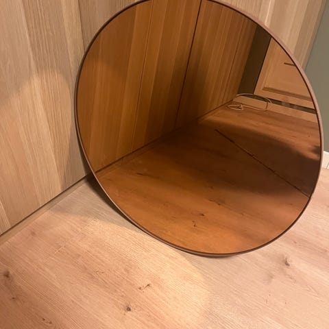 Rundt speil med tynn svart ramme. Har 2 stk for salg. Speilet har oppheng på baksiden for montering på vegg. Passer i gang, stue, soverom eller bad, avhengig av behov og tilgjengelig plass. Speilene måler 85 cm. Må hentes på Arnatveit.