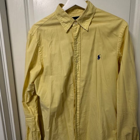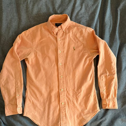 Ralph Lauren Slim Fit Stretch Oxford skjorte for herre i størrelse L. Skjorten er oransje og laget i bomull med stretch for bedre passform og bevegelighet. Modellen har klassisk krage, knappelukking i front og lange ermer med mansjetter. Brodert Polo-logo på brystet. Passer til både hverdagsbruk og mer formelle anledninger der en pen bomullsskjorte er ønsket.