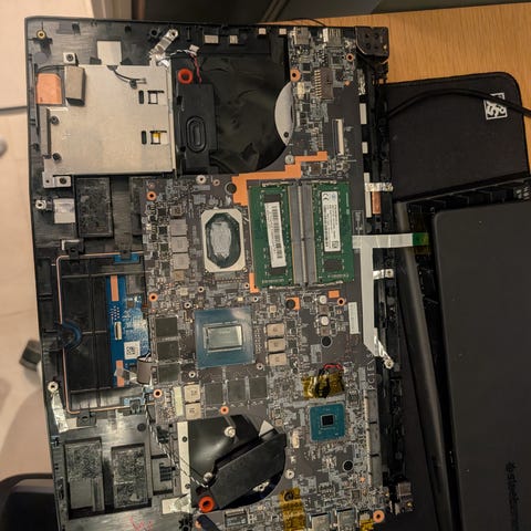 Lenovo bærbar PC innmat og komponenter: hovedkort, kjølevifter, batteri, høyttaler og trådløst nettverkskort. Dette kan egne seg som reservedeler eller for reparasjon og feilsøking av kompatible Lenovo‑maskiner. Spesifikke modellbetegnelser og tekniske data bør kontrolleres mot merkingen på delene og egen PC før bruk eller montering.