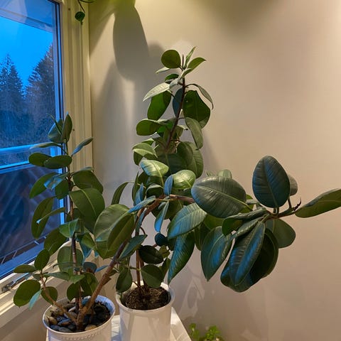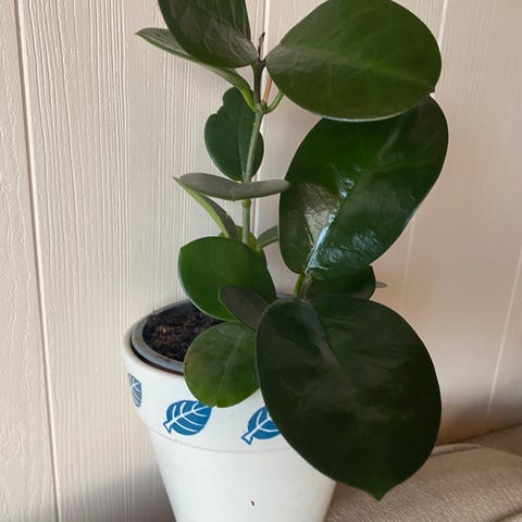 Grønn sukkulent i potte. Planten har tykke, ovale blader og står i en enkel blomsterpotte med mønster. Egner seg som inneplante og krever lite stell sammenlignet med mange andre stueplanter. Passer på vinduskarm, bord eller hylle i tørre og lyse rom. Kan vannes moderat og trives vanligvis best med mye indirekte lys.