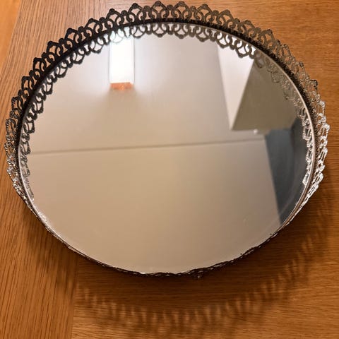 Svart speil/lysfat . 26 cm diameter. 5 cm høyde. Kan leveres Moa, Ålesund.
