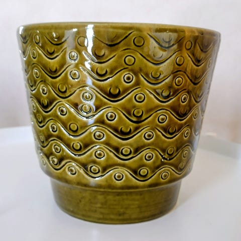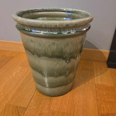 Vintage mosegrønn potteskjuler i god stand, svak krakelering.