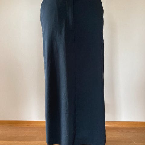 Langt skjørt i retromodell, noe utsvingt. Sidelommer. Glidelås bak og bred strikk i sidene.