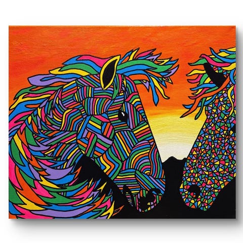 Maleri på lerret med abstrakt motiv av to hester i sterke, flerfargede mønstre mot en oransje solnedgang. Bildet har tydelige, sorte konturer og geometriske og prikkete mønstre i man og kropp. Passer som veggkunst i stue, gang eller andre oppholdsrom. Maleriet er rektangulært og montert på blindramme, klart til oppheng. 61x50cm og en pris på 3000kr