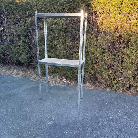Hvit hylle i metall med flere faste hyller. Egnet for oppbevaring i bod, garasje eller kjeller. Stabil konstruksjon med perforerte stolper som gir mulighet for justering av hyllehøyde avhengig av modellens utforming. Passer til lagring av esker, verktøy eller annet utstyr.