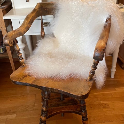 Konstruksjon: Svingbar stol med en firedelt fot i beiset tre.