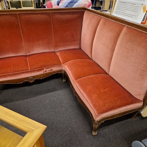 Materialer: Utført i rød eller «oxblood» skinn med dekorative nagler i messing/metall langs kantene.