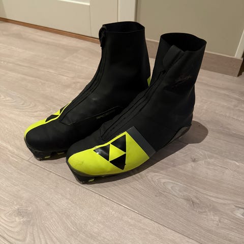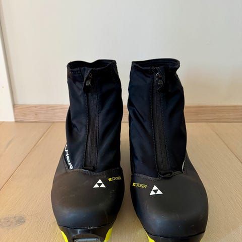 Fischer langrennsstøvler i størrelse EU 39. Modellen har overdel i syntetisk materiale med glidelås i front og integrert gamasj for å beskytte mot snø. Sålen er tilpasset moderne langrennsbindinger (se bilder av såle og bindingssystem for kompatibilitet). Fargekombinasjon svart med gule og hvite detaljer. Passer til klassisk langrennstrening og turbruk.