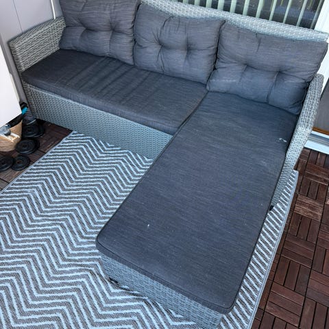 Sofaen har rette linjer med armlener på begge sider og plass til flere personer. Materialet er flettet kunstrotting i grå tone. På sitteflaten er det synlig slitasje og rifter i flettverket.