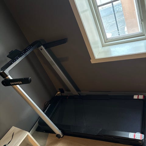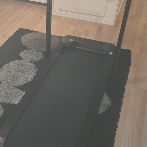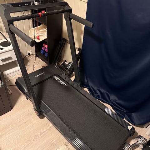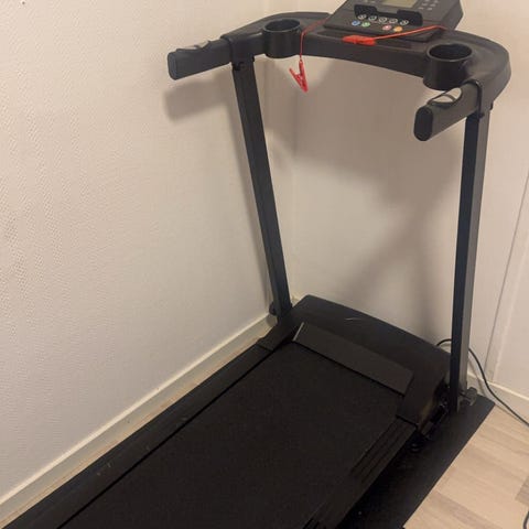Modellen er sammenleggbar og kan settes i vertikal posisjon for å spare plass ved lagring. Egnet til innendørs bruk for gange og løping. Det følger med sikkerhetsnøkkel som festes til brukeren under bruk.