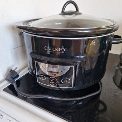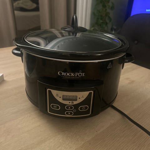 Crock-Pot® Express Multicooker selges rimelig. Minimalt brukt og fungerer som den skal. Dette er en kombinert trykkkoker og slow cooker med damp- og bruningsfunksjon og 5,7 liters kapasitet. Rist, røreskje,