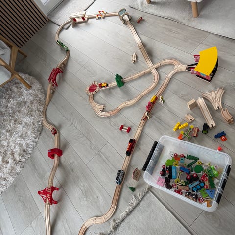 BRIO togbane i tre med ulike rette og buede skinner, kryss og sporvekslere. Sett med flere togvogner og lokomotiver i tre og plast, samt diverse tilbehør som bro, lasteutstyr og spor deler i plast. Passer til BRIOs klassiske tretogbane-system og kan kombineres med andre deler i samme serie.