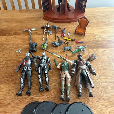 Fortnite Meowscles actionfigur med utskiftbart hode og flere våpentilbehør. Medfølgende tilbehør inkluderer ekstra hode, to kniver, to pistoler og et større våpen. Figuren har bevegelige ledd som gjør den egnet til lek og posering. En del av Fortnite-universet og populær blant samlere av actionfigurer. Ca 20 cm høy, laget i solid plast.
