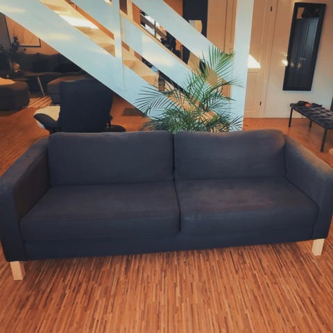 IKEA sofa i mørkeblå sofa. Sofaen har rette armlener og løse ryggputer. Passer som sittemøbel i stue eller oppholdsrom. Designet er enkelt og funksjonelt, med plass til flere personer. Stofftrekket fremstår som et nøytralt, mørkt tekstil som egner seg i ulike interiørstiler.