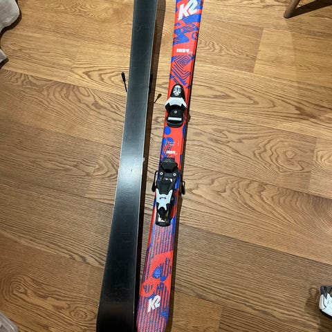K2 Indy alpinski på 100 cm med bindinger. Skiene har en midtbredde på 70 mm (102-70-91).