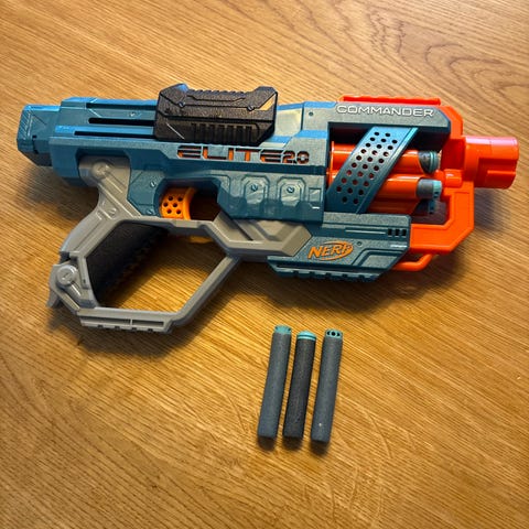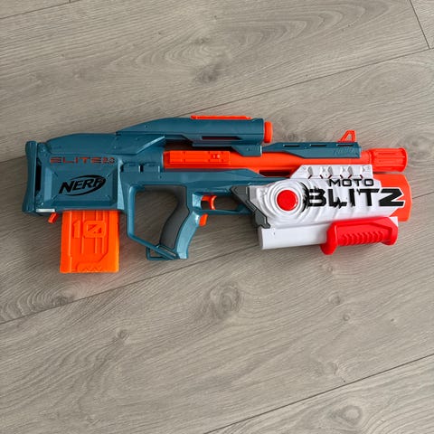 Nerf Elite lekegevær i blå og oransje plast. Modellen har batteridrevet trommelmagasin foran og skulderstøtte bak. Egnet som uteleke eller innendørs lek med skumprosjektiler. Brukes med tilhørende Nerf-skumdarts, 20 st inkludert.