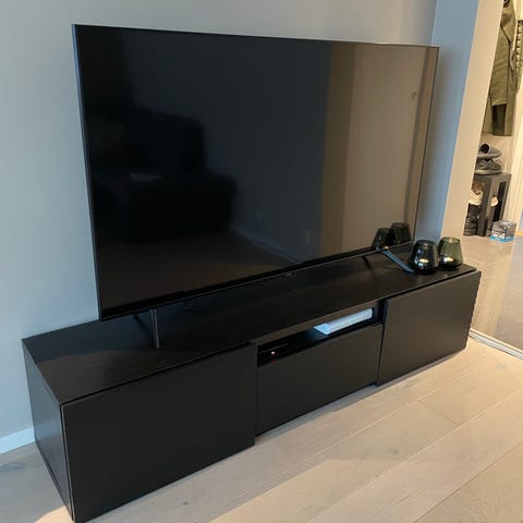 Samsung TV i svart utførelse. Flatskjerm-TV med bordstativ og tilhørende fjernkontroll, som vist på bildene. Egnet for bruk i stue, soverom eller andre rom der det er behov for en TV med innebygde smartfunksjoner og apper som kan gi tilgang til strømmetjenester og annet innhold. Tilkoblingsmuligheter og øvrige spesifikasjoner fremgår av bildene av baksiden av TV-en.