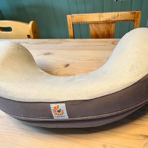 Ergobaby ammepute i halvmåneform. Puten har overflate i mykt stoff på oversiden og brun kant på siden. Utformingen gir støtte rundt midjen og kan brukes ved amming eller flaskemating for å gi stabil og ergonomisk støtte til både barn og voksen. Trekket kan tas av og vaskes.