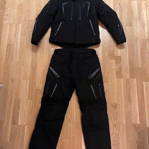 Modeka motorsykkelsett bestående av jakke og bukse i størrelse 2XL. Sett i svart farge, laget i slitesterkt Cordura/Tactel-materiale. Buksen har seler, avtagbar innlegg for kalde turer og flere Gode luftelommer, samt både vanntette og vanlige lommer. Jakken har glidelås og justeringsmuligheter. Avtagbar innlegg. Gode lufte lommer. Egnet som kjøreutstyr til motorsykkel med fokus på beskyttelse og komfort på tur.