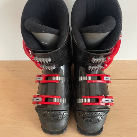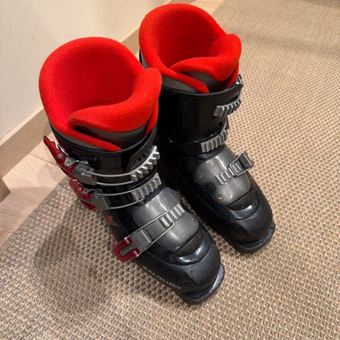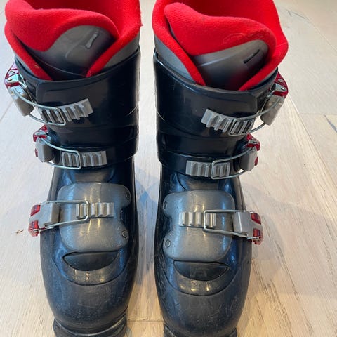 Salomon Performa T2 alpinstøvler for barn. Støvlene er svarte med rød innersko og røde detaljer på spennene. Modellen har to justerbare spenner i metall/plast for enkel tilpasning og god støtte. På sålen er det merket 240 mm og størrelsen 18/19. Passer til bruk med vanlige alpinski-bindinger for barn. Eu størrelse ca. 29-31. må hentes