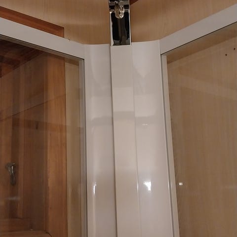 Dusjkabinett i hjørnemodell med buet front og skyvedører i glass. Kabinettet har integrert dusjsøyle med hånddusj og blandebatteri, samt hvit dusjkar i bunn. Egnet for montering i baderomshjørne der man ønsker en lukket dusjløsning med glassvegger og dører som kan skyves til siden for enkel adkomst.