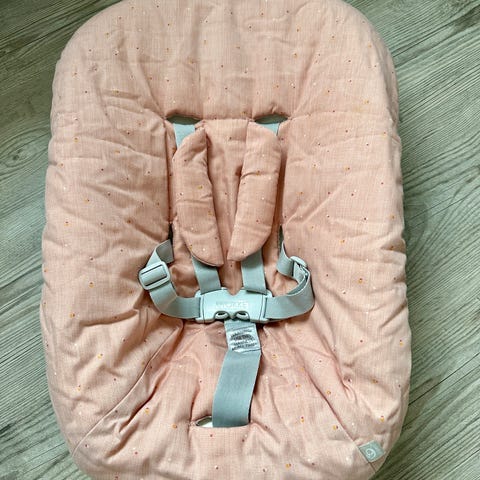 ☀️Stokke Nyfødt sett til Tripp Trapp Stokke stol, eldre versjon med kun en sittestilling. Alt er nyvasket og klar til ny eier. Følger med ekstra trekk som vist på bildet over, liten flekk på den rosa siden se bilde 7.