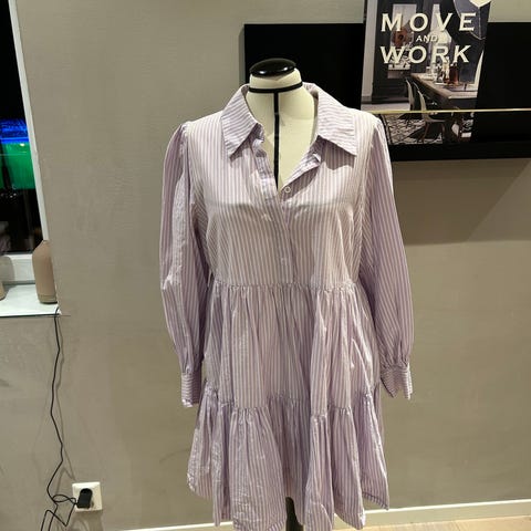 By Malina hverdagskjole i grå viskose i størrelse M for dame. Kjolen har lange ermer med broderte detaljer og knappelukking foran. Den leveres med matchende belte i livet og har lett rynket nederkant. Materialet i viskose gir et mykt og lett uttrykk, egnet til hverdagsbruk og enkle anledninger.