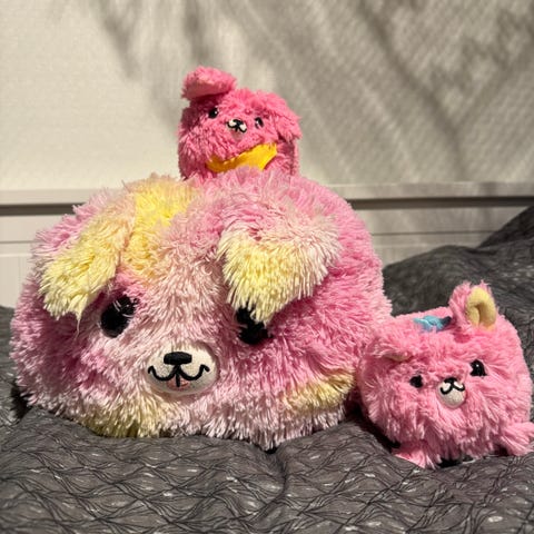 Bamse kosedyr sett i mykt plysjmateriale. Settet består av to kosedyr i ulike størrelser, med rund form og flerfargede pastellnyanser. Dyrene har broderte ansiktstrekk og er laget for lek og kos. Passer for barn som liker myke kosedyr og fantasifigurer.