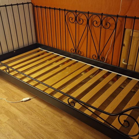 Pent brukt seng i svart smijern selges. Sengen har et dekorativt og tidløst design med fine detaljer i rygg- og sidegavler. Solid og stabil konstruksjon som passer perfekt som gjesteseng, på barnerom eller ungdomsrom.