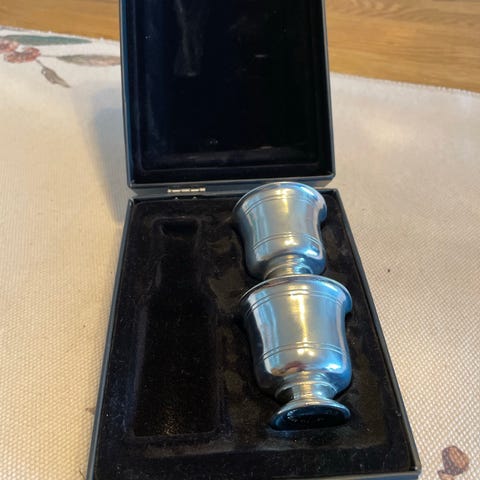 Selger et sett akkevittkrus med motiv Trondhjemsrose fra Gullsmed Møller i Trondheim. Material er Tunsberg antikktinn. Ligger i gaveeske.