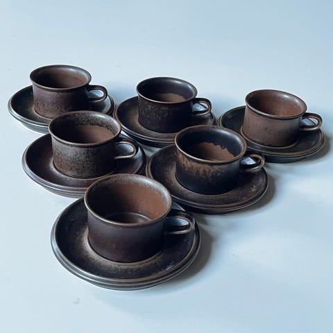 Selger 4 stk. vintage kaffekopper med skål fra Arabia, modell Fennica. Finsk design av Ulla Procopé med dekor av Richard Lindh. Produsert på slutten av 70-tallet. Retro. Koppene er 7,7 cm høye og 7 cm i diameter. Skålene er 12,5 cm i diameter. Bra stand. Ingen skader. 200 kr samlet. Kan hentes (Grünerløkka eller Sentrum) eller sendes.