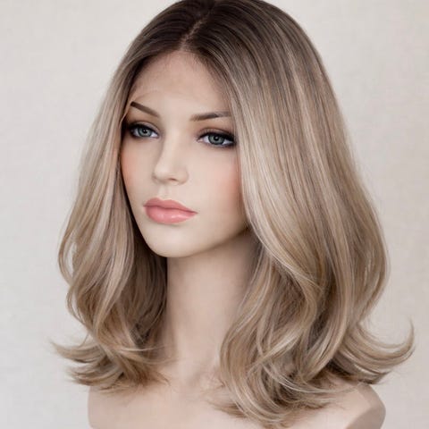 Parykk med langt hår i blond ombre-farge med mørkere bunn og lysere lengder. Håret er glatt med lett fall. Fronten har blondetopp/lace-front for mer naturlig hårfeste.